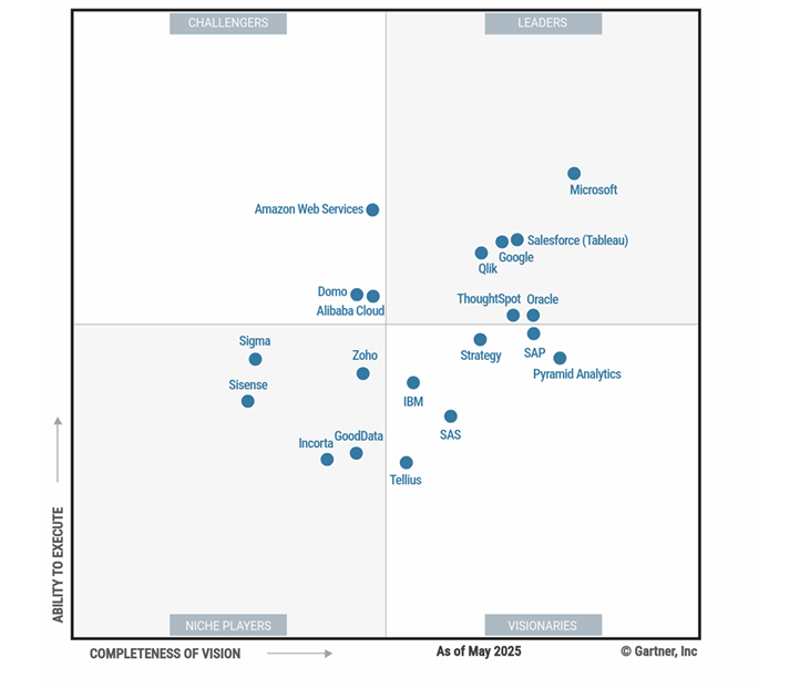 Qlik este recunoscut ca unul dintre liderii din acest Magic Quadrant, fiind apreciat pentru integrarea completă a capabilităților de analiză, automatizare și inteligență artificială într-un ecosistem unificat denumit Qlik Cloud Analytics. Platforma include componente precum Qlik Sense, Qlik Predict și Qlik Automate.